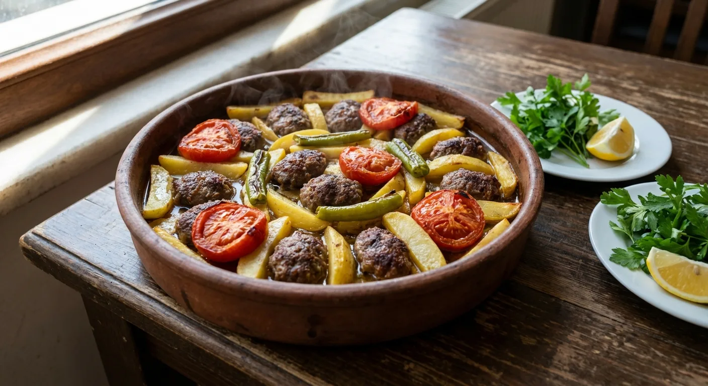 Fırında köfte patates, Türk mutfağının sevilen ve geleneksel bir yemeğidir, kökeni Osmanlı İmparatorluğu'na kadar uzanır. Hem köfte hem de patates, zengin Anadolu mutfağında yer alan malzemelerdir; köftenin kıvamı ve lezzeti, yöresel baharatlarla zenginleştirilirken, patates ise yemeğe hem besleyicilik hem de tat katmaktadır. Bu yemek, özellikle aile sofralarında bir araya gelmeyi simgeler ve misafir ağırlama geleneklerinde önemli bir yere sahiptir.