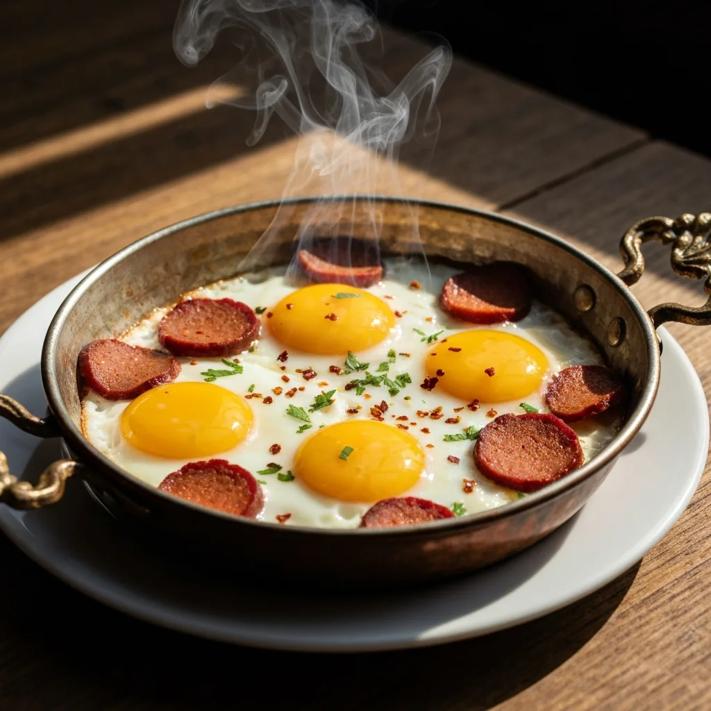 Sucuklu sahanda yumurta, Türk mutfağının sevilen kahvaltılıklarından biridir ve özellikle Anadolu'da popülerdir. Kökeni, Osmanlı İmparatorluğu dönemine kadar uzanan sucuk, kıyma ve baharatların karışımıyla yapılan bir şarküteri ürünü olarak bilinir; yumurta ile birleşimi ise zengin ve doyurucu bir öğün sunar. Bu lezzetli yemek, hem evde hem de restoranlarda sıkça tercih edilmekte olup, Türk kahvaltısının vazgeçilmezlerinden biri olarak kültürel bir simge haline gelmiştir.