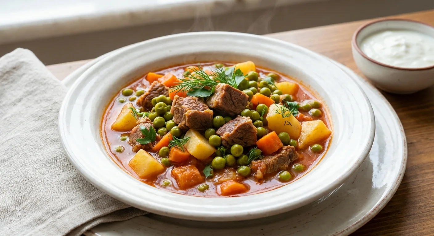Etli bezelye yemeği, Türk mutfağının sevilen ve besleyici yemeklerinden biridir; özellikle bahar aylarında taze bezelye ile yapılmasıyla bilinir. Osmanlı İmparatorluğu döneminde, sebze yemeklerinin zenginlik ve çeşitlilik bakımından önem kazandığı bir dönemde ortaya çıkmıştır. Hem lezzeti hem de besin değeriyle aile sofralarında sıkça yer bulan bu yemek, Türk kültüründe paylaşımın ve birlikte yemeğin simgelerinden biri haline gelmiştir.