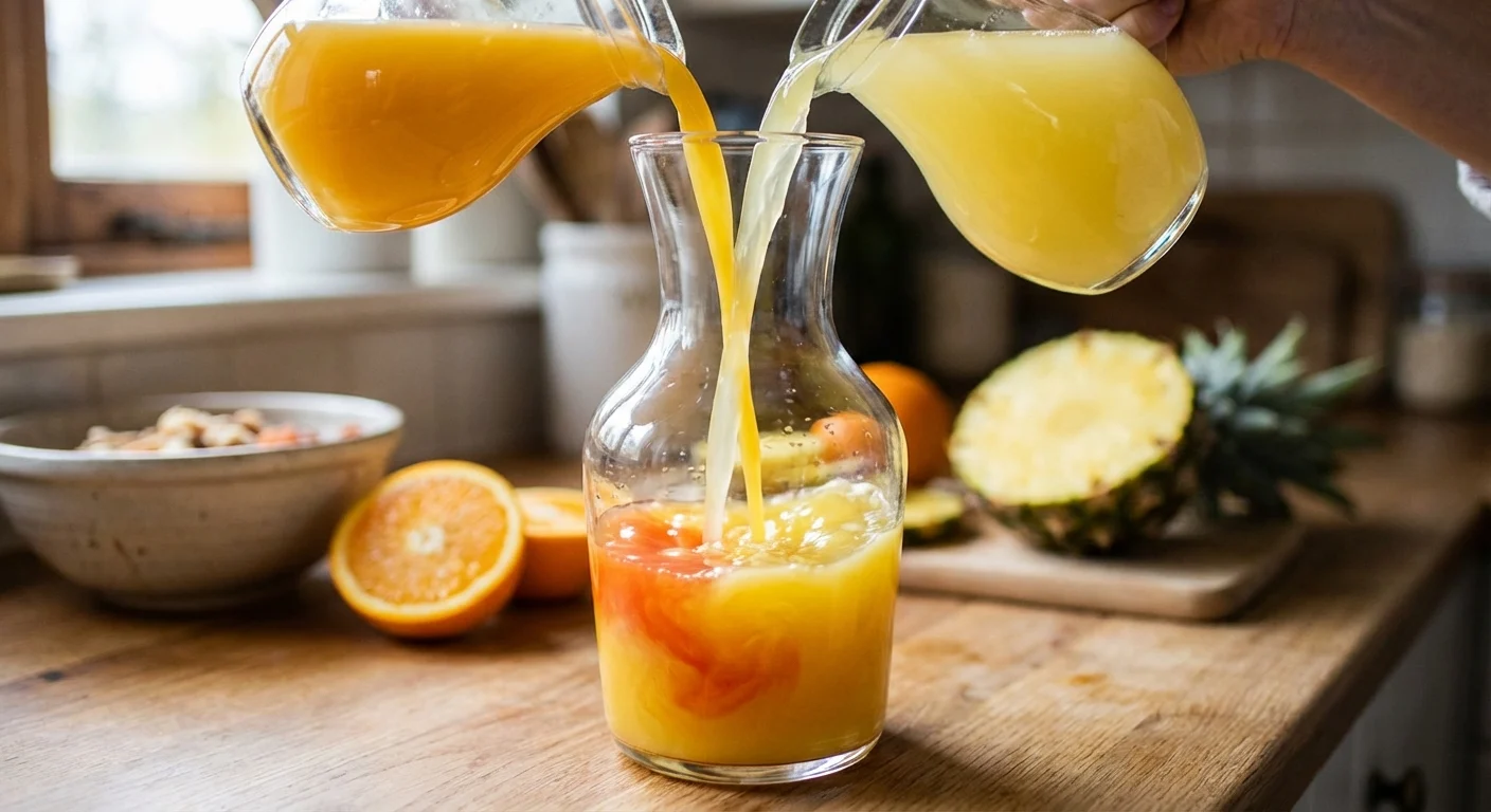 Üzerine taze sıkılmış portakal suyunu ve ananas suyunu ekleyin.