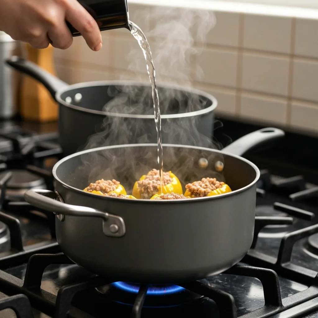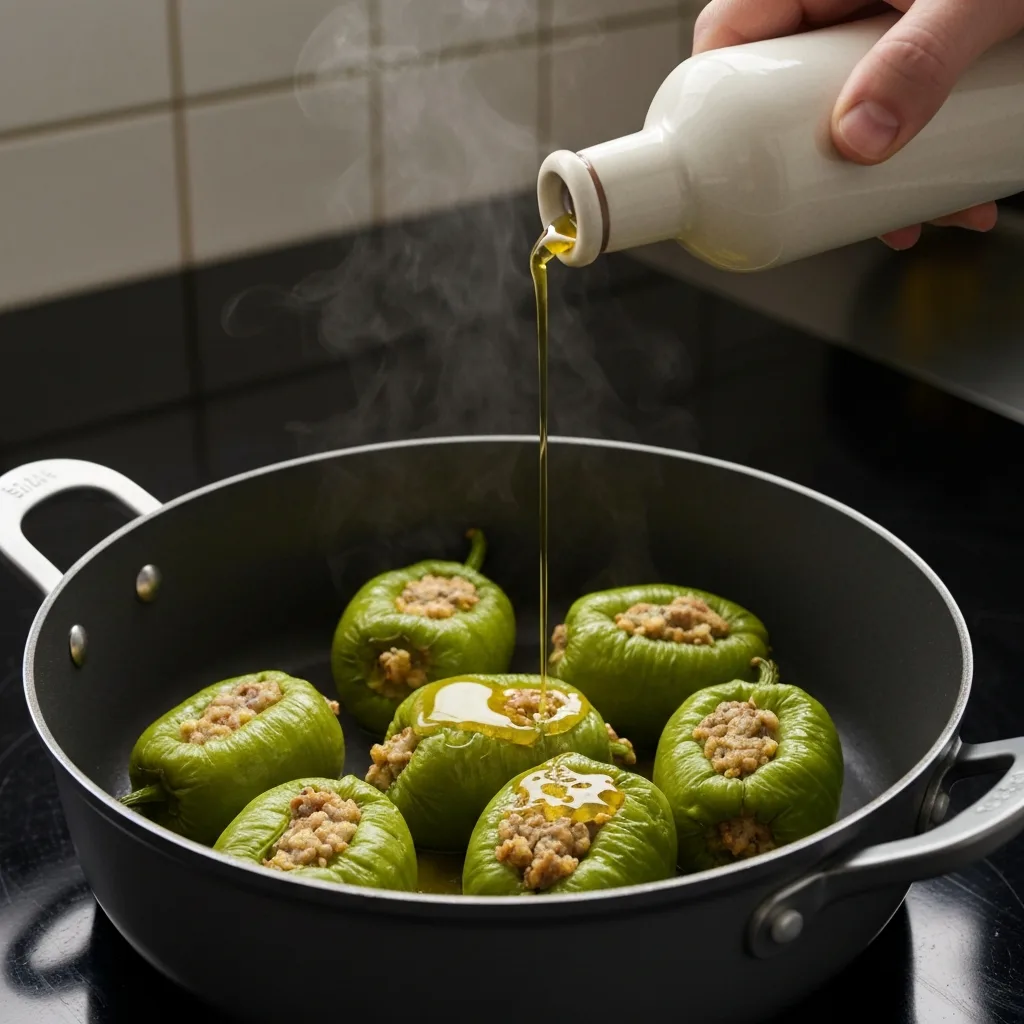 Kalan zeytinyağını üzerlerinde gezdirin. Tencerenin kenarından, biberlerin yarısına gelecek kadar sıcak su ekleyin.