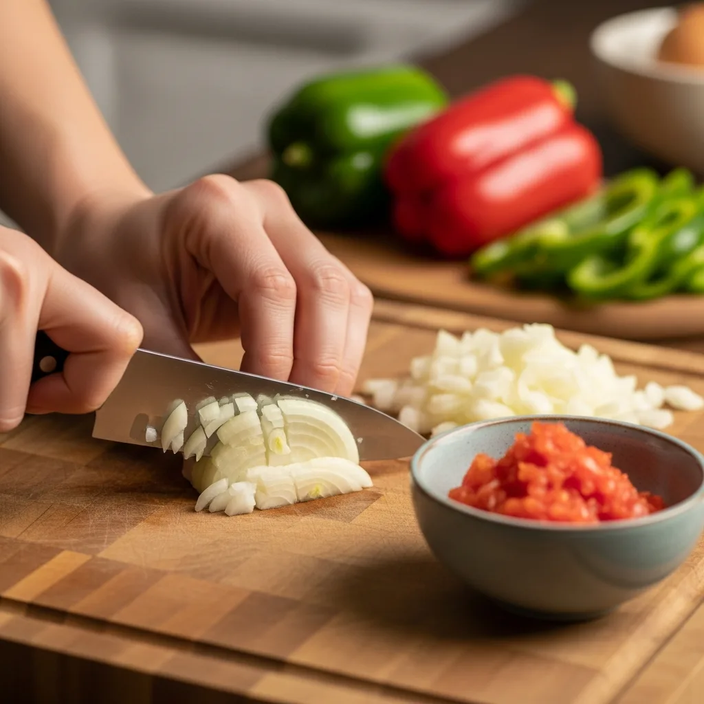 Soğanları ince ince yemeklik doğrayın. Domateslerin birini rendeleyin, diğerini biberlerin ağzını kapatmak için yuvarlak dilimleyin.