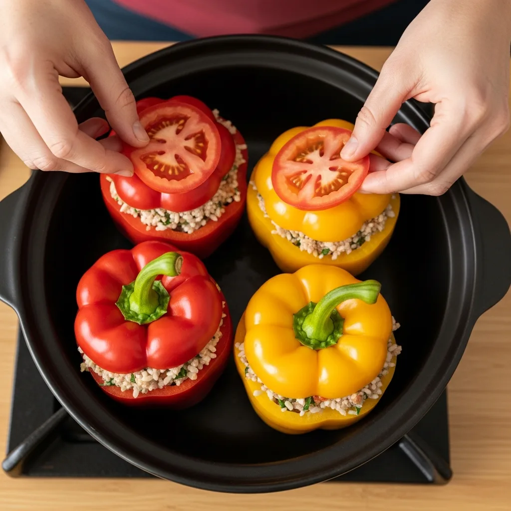 Doldurduğunuz biberleri geniş bir tencereye dik olarak dizin. Üzerlerini domates dilimleriyle kapatın.