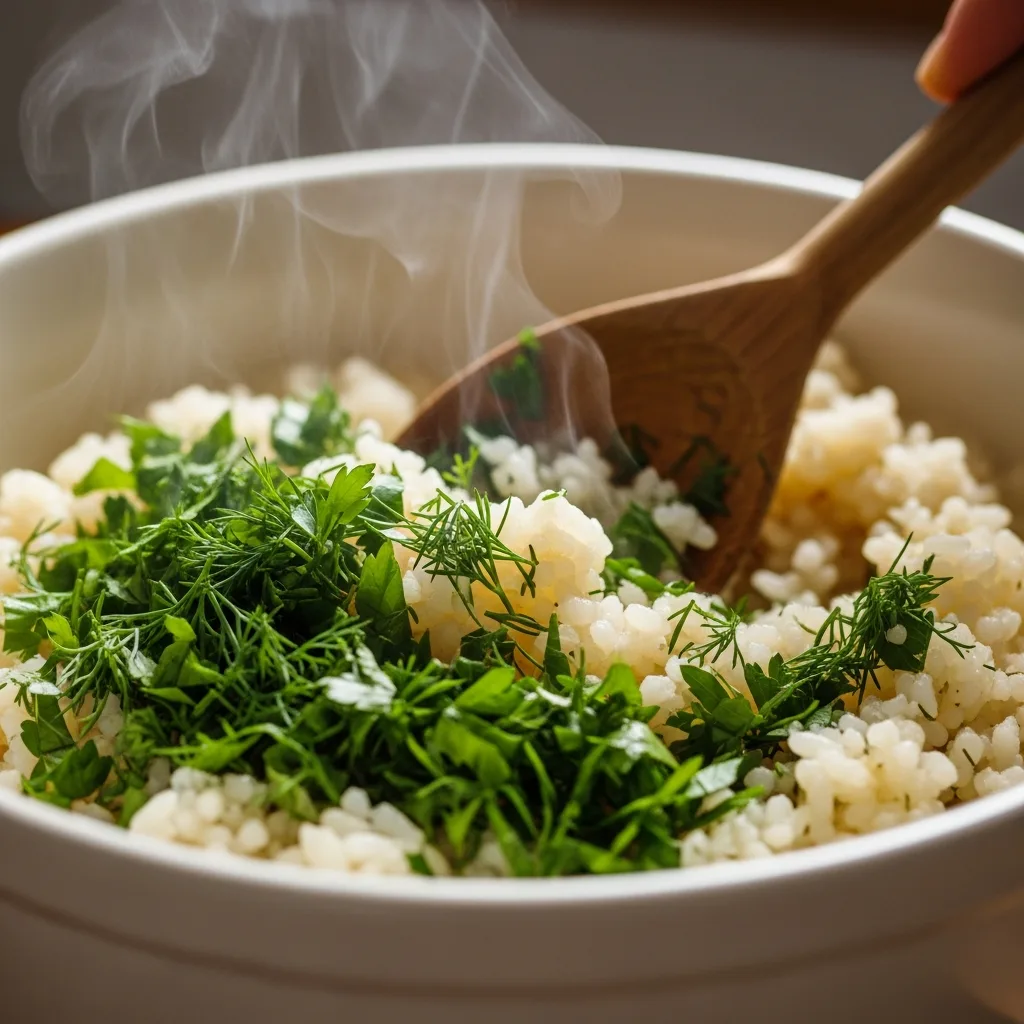Karışıma 1 su bardağı sıcak su ekleyin ve pirinçler suyu çekene kadar kısık ateşte pişirin. Ateşten alıp ince kıyılmış maydanoz ve dereotunu ekleyip karıştırın ve harcı demlenmeye bırakın.