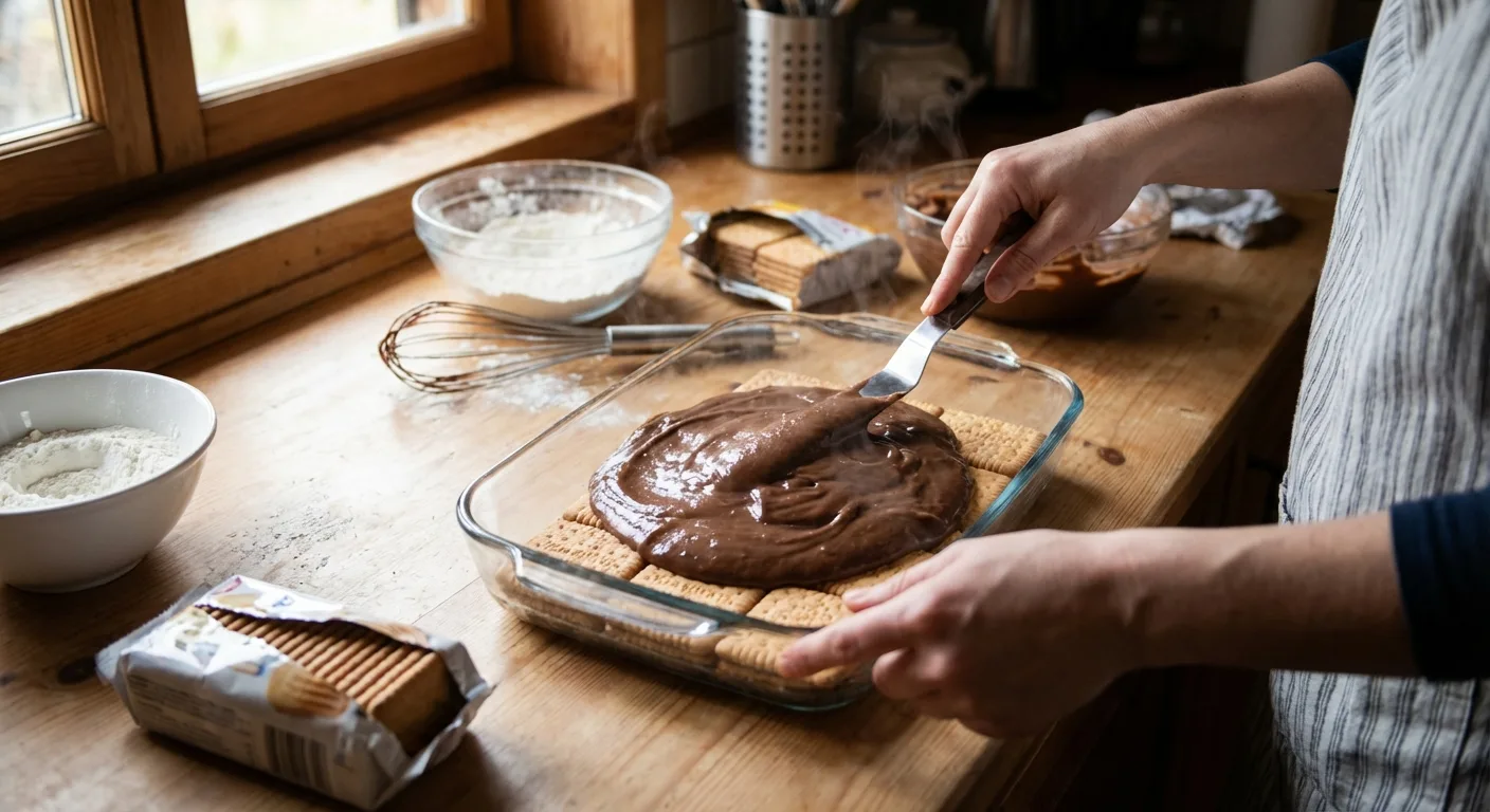 Dikdörtgen bir borcamın tabanına bir kepçe puding yayın. Üzerine bir sıra bisküvi dizin.