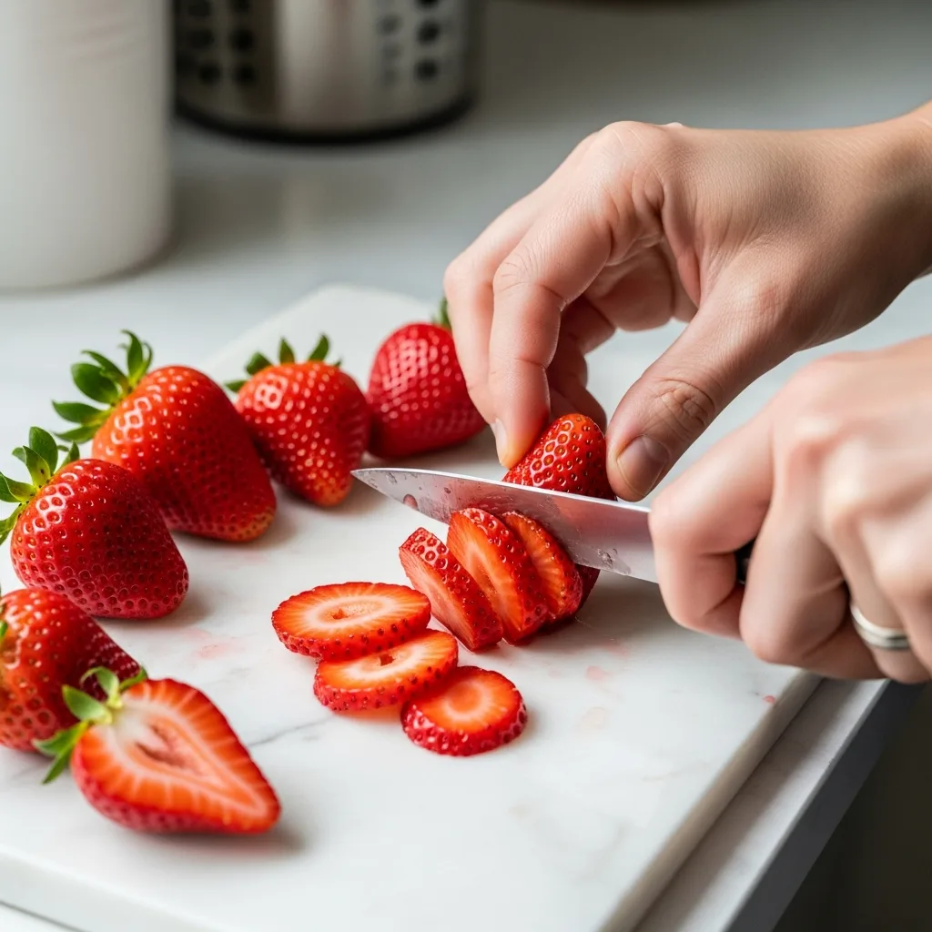 Çilekleri yıkayın, saplarını ayıklayın ve isteğe bağlı olarak ikiye veya dörde bölün. Büyük çilekleri doğramak daha iyi sonuç verir.