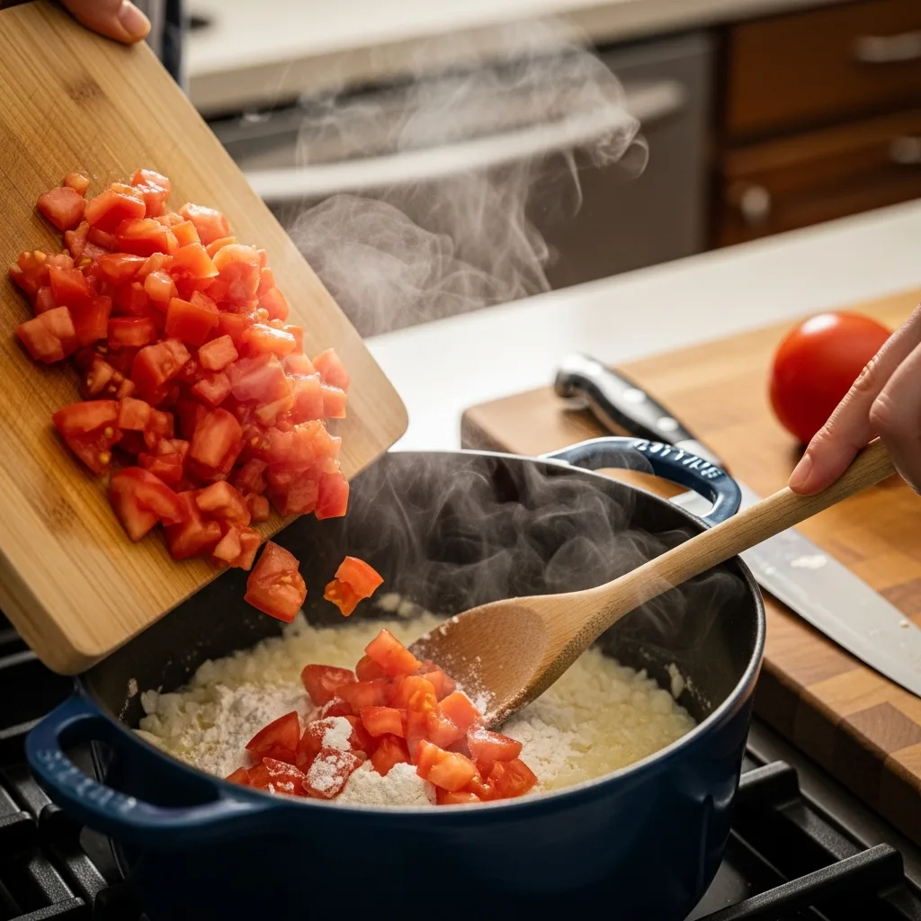 Doğranmış domatesleri tencereye ekleyin ve domatesler suyunu salıp çekene kadar birkaç dakika karıştırarak pişirin.