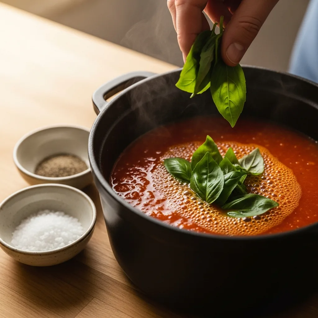 Tuz, karabiber ve taze fesleğen yapraklarını ekleyip çorbayı kaynamaya bırakın. Kaynadıktan sonra altını kısıp domatesler iyice yumuşayana dek yaklaşık 15 dakika pişirin.