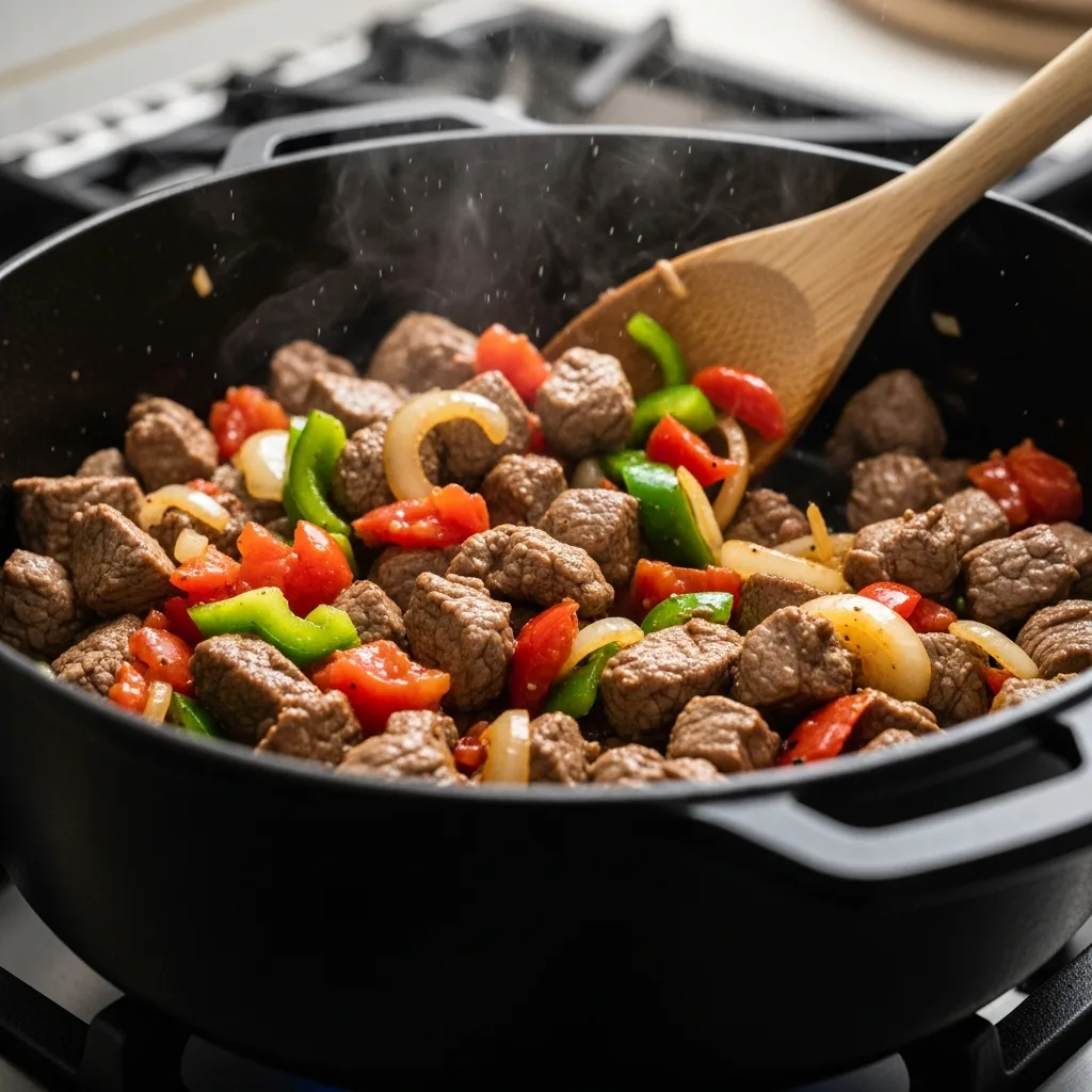 Tencereye yağı alın ve ısınınca kuşbaşı etleri ekleyip rengi dönene kadar mühürleyin.