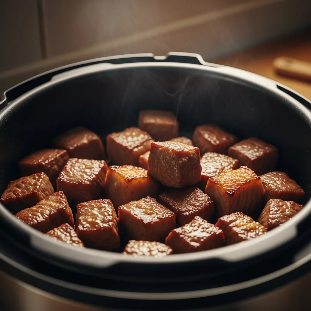 Düdüklü tencereye sıvı yağ ve tereyağını alıp ısıtın. Kuşbaşı etleri ekleyip suyunu salıp çekene kadar kavurun.