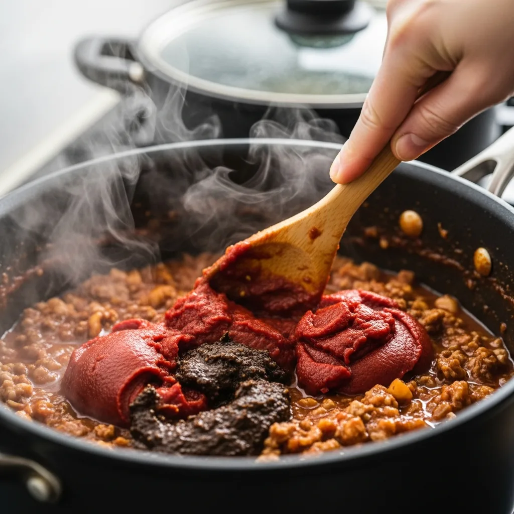 Domates ve biber salçalarını ekleyip kokusu çıkana kadar 1-2 dakika daha kavurun.