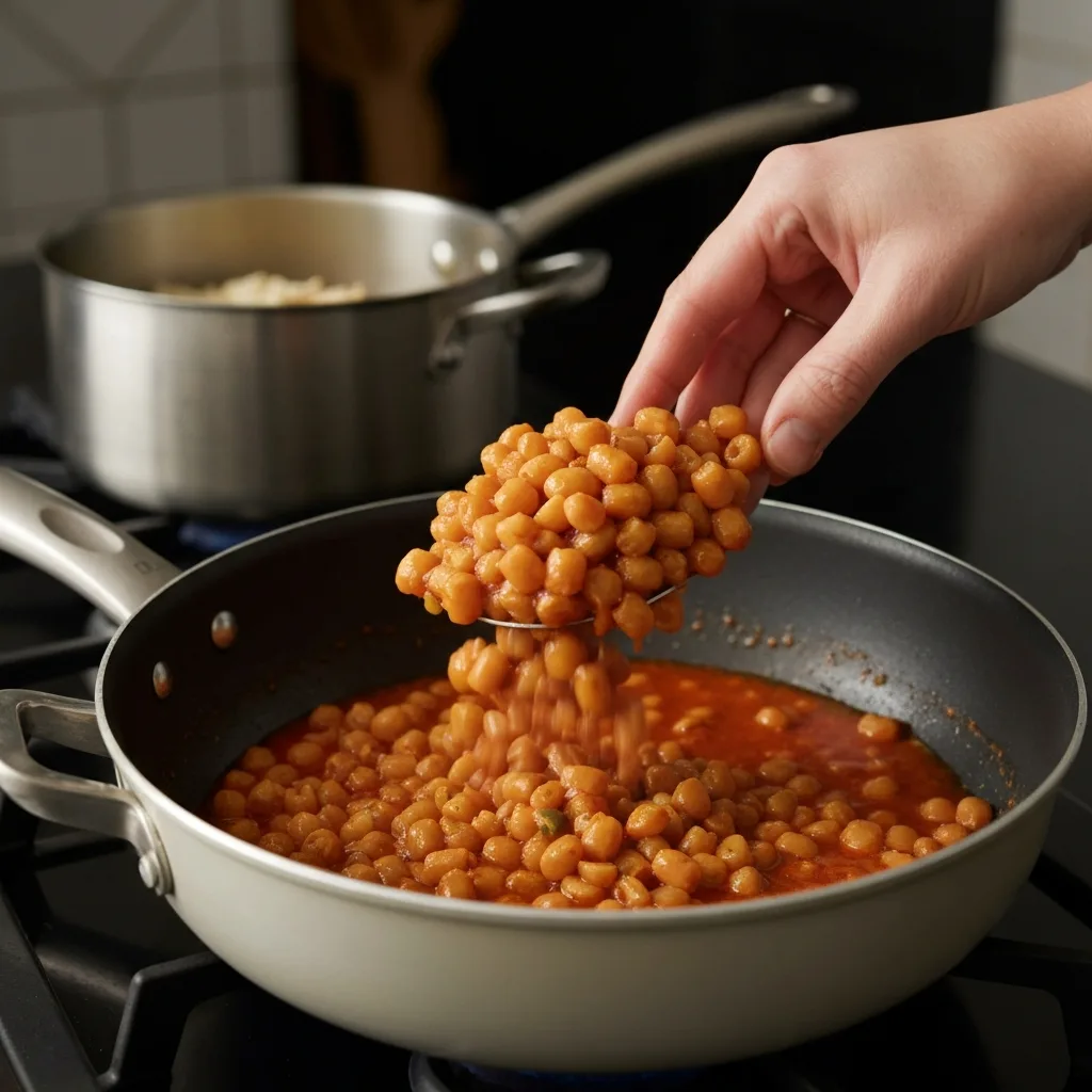 Süzülmüş fasulyeleri, tuzu, karabiberi ve pul biberi tencereye ekleyip karıştırın.