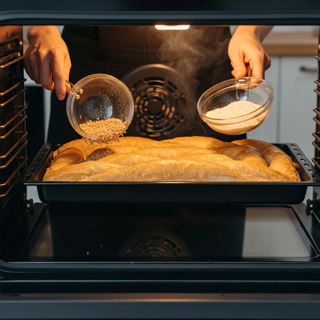 Önceden ısıtılmış 180°C fırında üzeri ve altı güzelce kızarana kadar yaklaşık 40-50 dakika kontrollü pişirin.