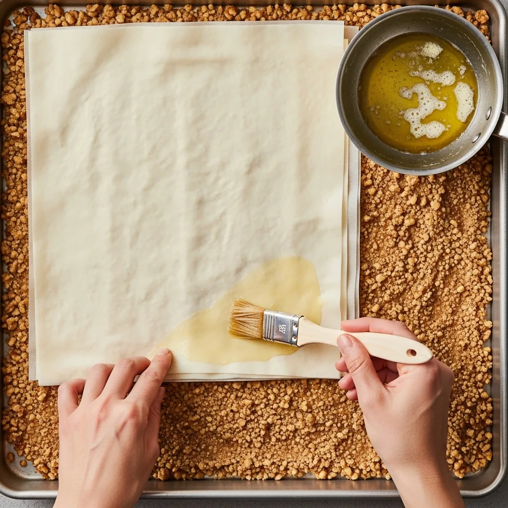 Tepsiyi yağlayın ve baklava yufkasının bir katını serin, üzerine fırça yardımıyla yağ karışımından sürün. Her iki yufkada bir yağ sürerek yufkaların yarısını tepsiye dizin.