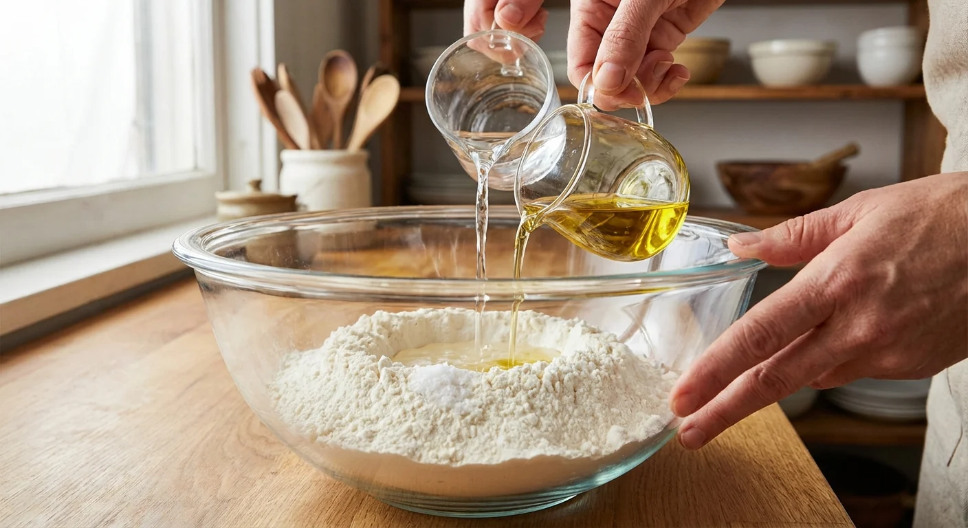 Açtığınız havuza ılık suyu ve sıvı yağı dökün. Kenarlardaki undan yavaş yavaş alarak hamuru toparlamaya başlayın.