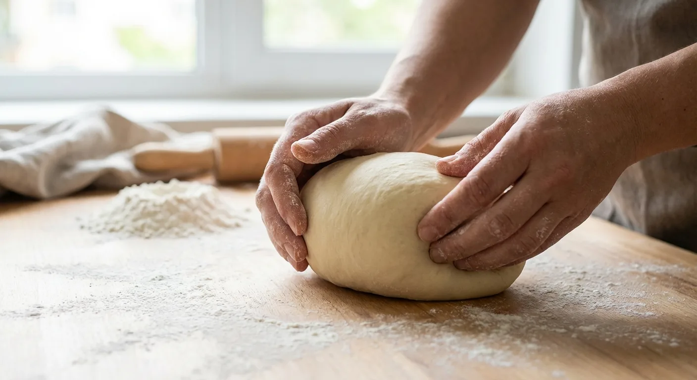 Hamur toparlandıktan sonra unlanmış tezgaha alıp pürüzsüz ve ele yapışmayan bir kıvam alana kadar yaklaşık 5-10 dakika yoğurun.