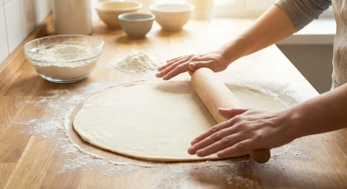 Dinlenen hamurdan cevizden biraz büyük bezeler koparın ve unlanmış tezgahta bir merdane yardımıyla olabildiğince ince ve yuvarlak şekilde açın.