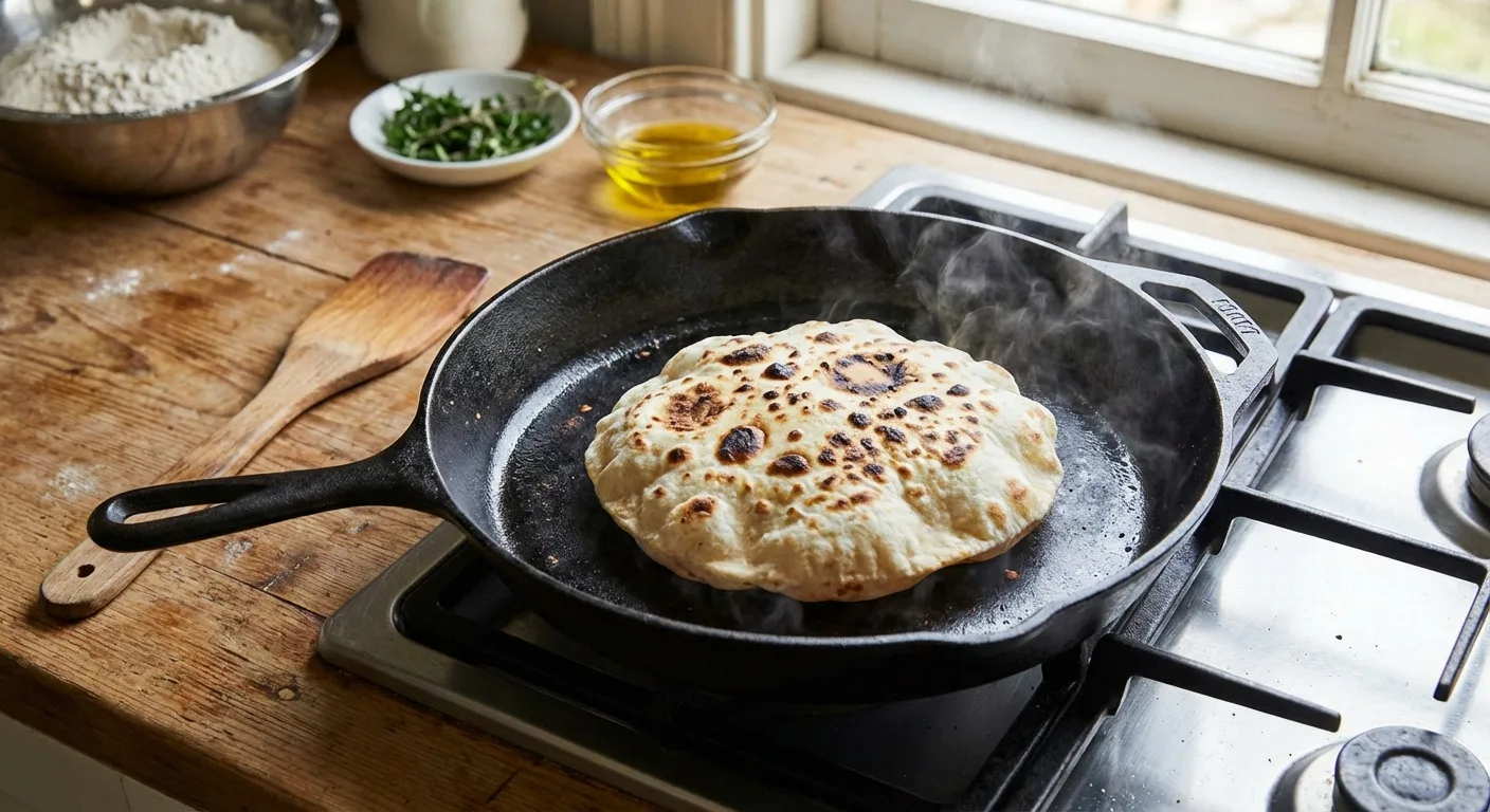 Üzerinde baloncuklar oluşup hafif kahverengi benekler belirmeye başlayınca bir maşa yardımıyla çevirin ve diğer yüzünü de aynı şekilde pişirin.