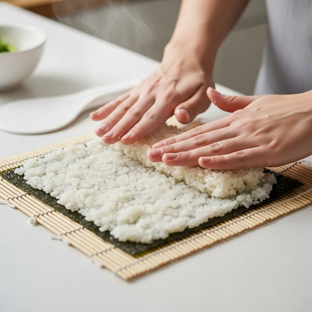Bambu matın (makisu) üzerine nori yaprağını parlak tarafı alta gelecek şekilde yerleştirin. Ellerinizi hafifçe ıslatarak soğumuş pirinçten bir avuç alıp nori'nin üzerine, üst kenarda yaklaşık 2 cm boşluk bırakarak yayın. Pirincin üzerine susam serpebilirsiniz.