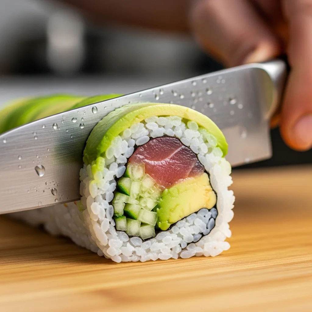Çok keskin ve ıslak bir bıçak kullanarak ruloyu önce ortadan ikiye, ardından her bir parçayı 3-4 eşit parçaya bölerek dilimleyin. Soya sosu, wasabi ve zencefil turşusu ile hemen servis yapın.
