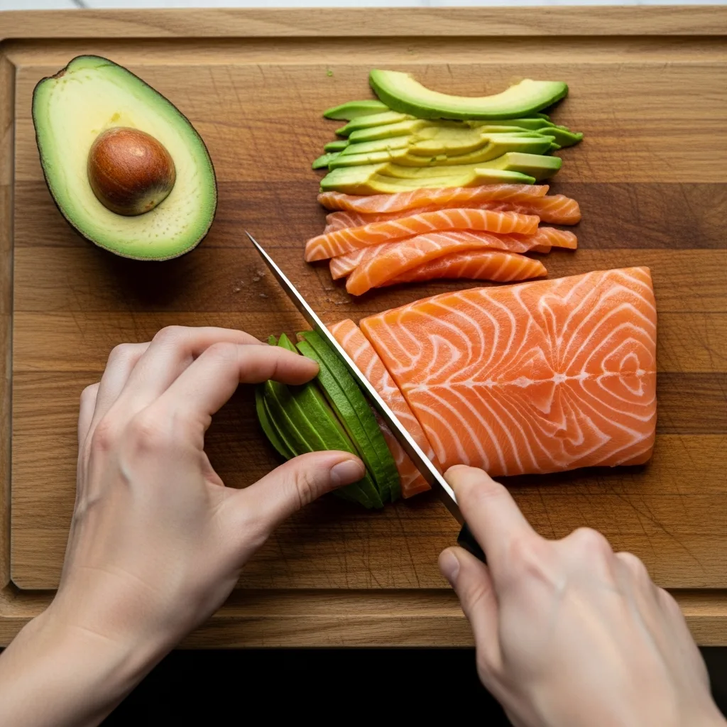 İç malzemeleri hazırlayın. Salatalık, avokado ve kullanacağınız deniz ürününü (surimi, somon vb.) ince uzun şeritler (jülyen) halinde kesin.