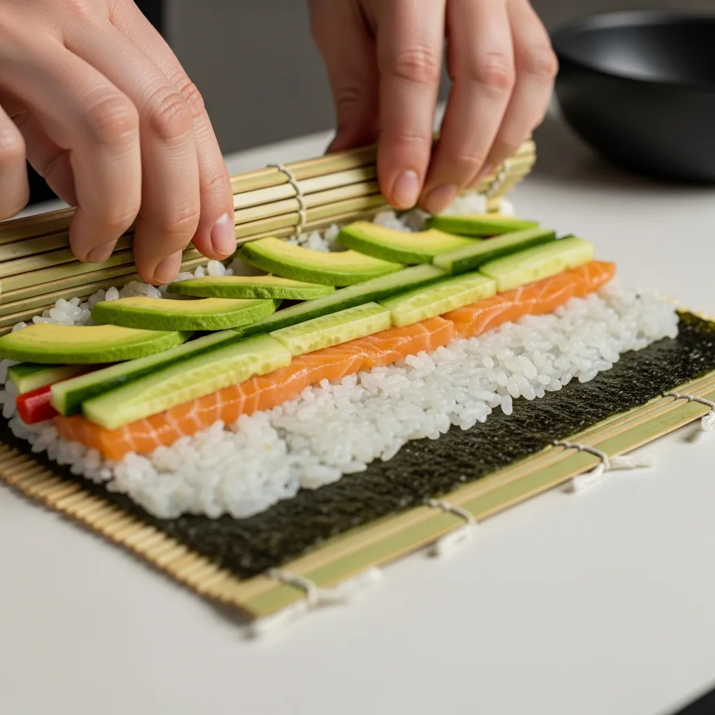 Pirinçli yüzeyin size yakın olan kenarına hazırladığınız iç malzemelerden bir sıra halinde dizin. Bambu mat yardımıyla, başparmaklarınızla matı destekleyerek nori'yi sıkıca kendinize doğru yuvarlayın. Rulonun ucunu birkaç pirinç tanesiyle veya suyla yapıştırın.