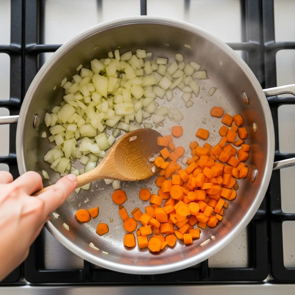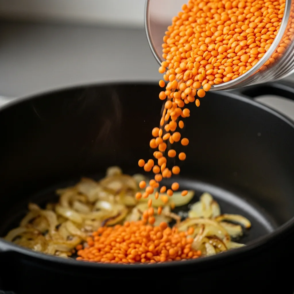 Yıkanmış kırmızı mercimekleri ekleyip 1-2 dakika daha kavurun. Sıcak suyu, tuzu ve karabiberi ekleyip mercimekler yumuşayana kadar pişirin.