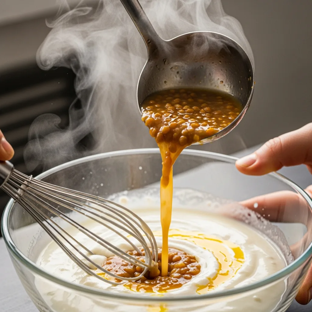 Çorbanın sıcak suyundan bir kepçe alıp yavaşça ve sürekli karıştırarak terbiyeye ekleyin (bu işleme ılıştırma denir ve terbiyenin kesilmesini önler).