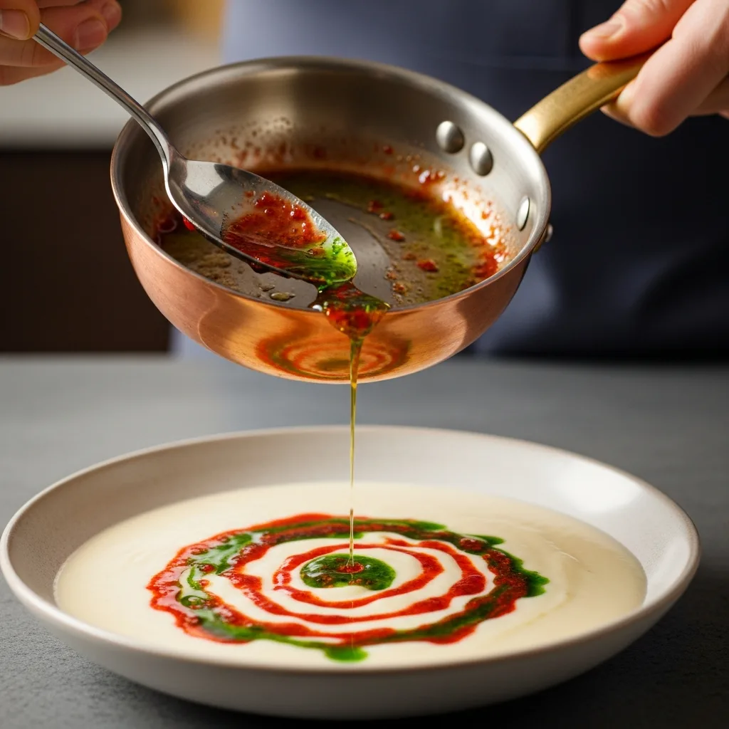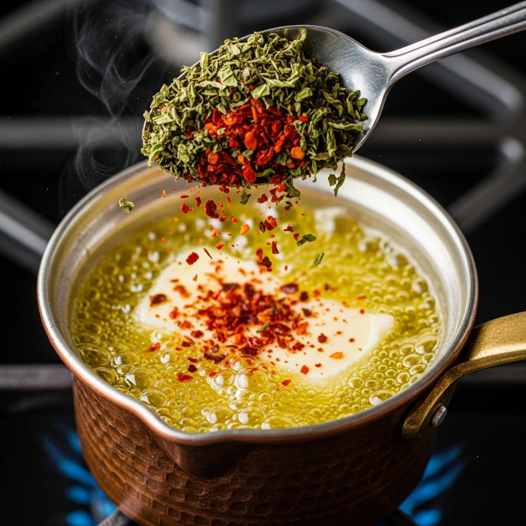 Küçük bir tavada tereyağını eritin. Nane ve pul biberi ekleyip hafifçe kızdırın.