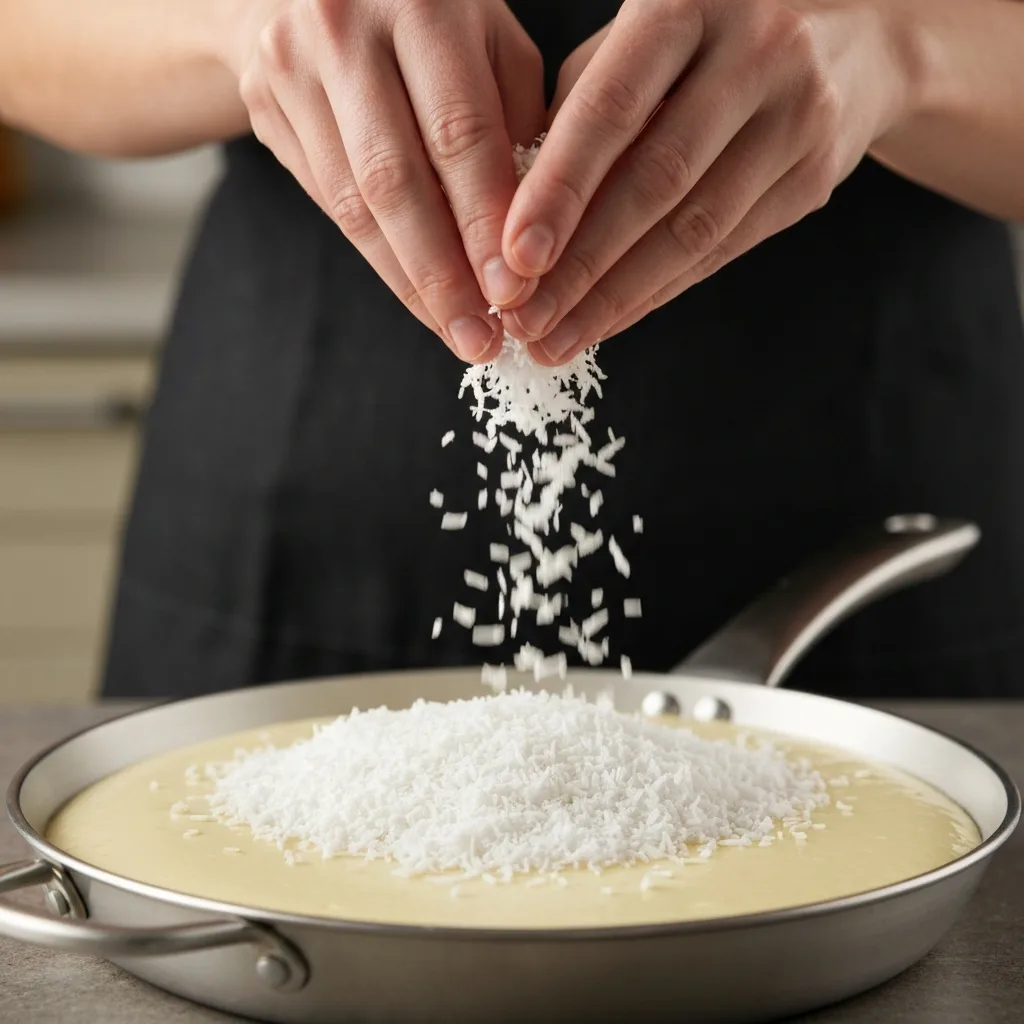 Servis yapmadan önce üzerini tamamen kaplayacak şekilde bolca Hindistan cevizi serpin ve dilimleyerek servis edin. Afiyet olsun!