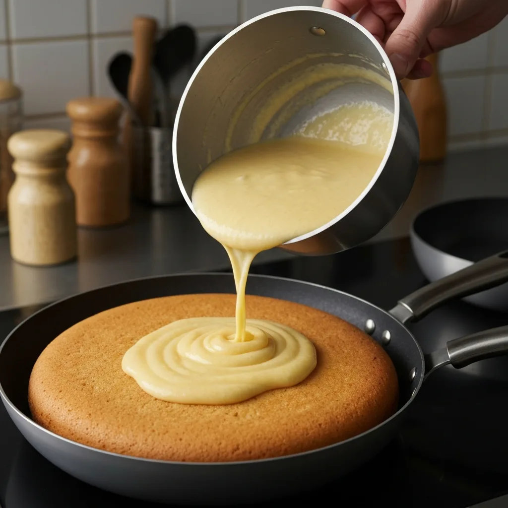 Hazırladığınız sıcak muhallebiyi, sütü tamamen çekmiş olan kekin üzerine dökün ve bir spatula yardımıyla yayın.