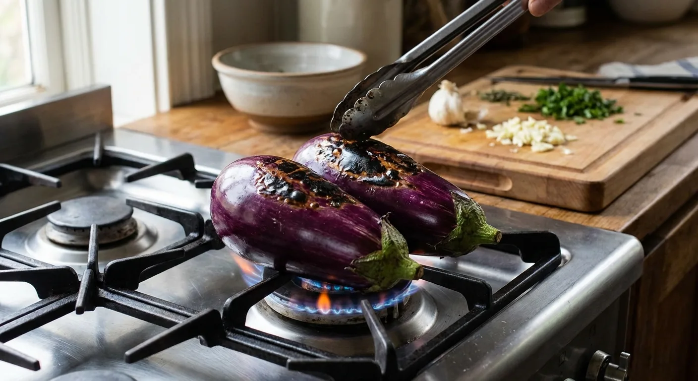 Patlıcanları birkaç yerinden delip ocakta veya fırında közleyin. Kabuklarını soyup ince ince kıyın.