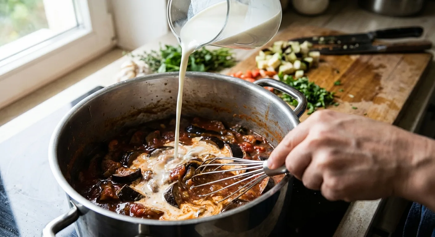 Sütü yavaş yavaş ve sürekli karıştırarak ekleyin, pürüzsüz bir kıvam almasını sağlayın. Tuz, karabiber ve muskat rendesini ilave edin.