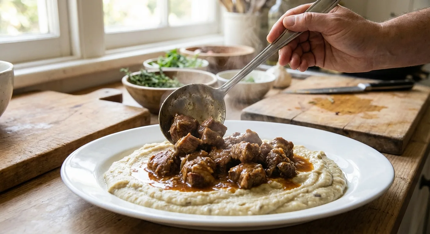 Servis tabağının zeminine sıcak beğendiyi yayın. Üzerine pişen etleri suyuyla birlikte gezdirerek servis yapın.