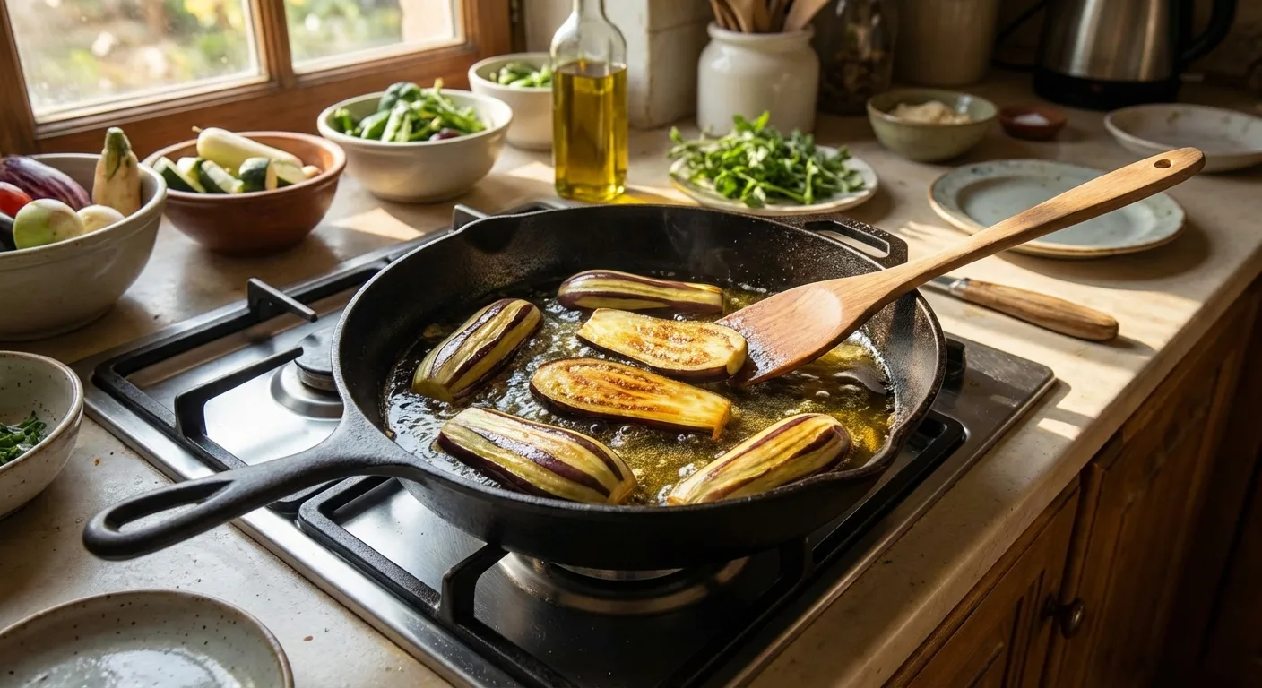 Patlıcanları alacalı soyup acısının çıkması için tuzlu suda 20 dakika bekletin. Ardından kurulayıp bol zeytinyağında her tarafı yumuşayana kadar kızartın ve fazla yağını almak için kağıt havlu üzerine alın.