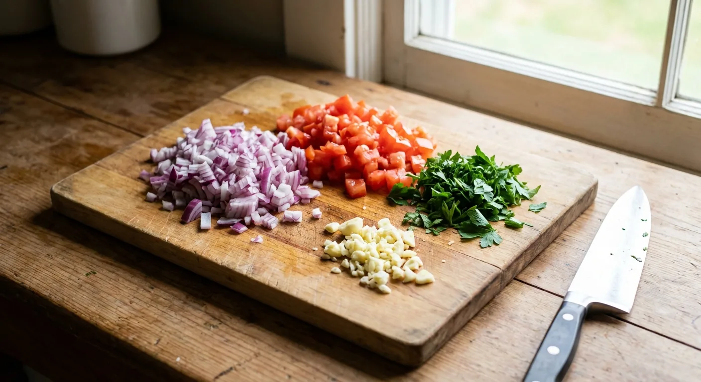 İç harç için soğanları piyazlık doğrayın. Sarımsakları ve domateslerin 2 tanesini küçük küpler halinde kesin. Maydanozu ince ince kıyın.