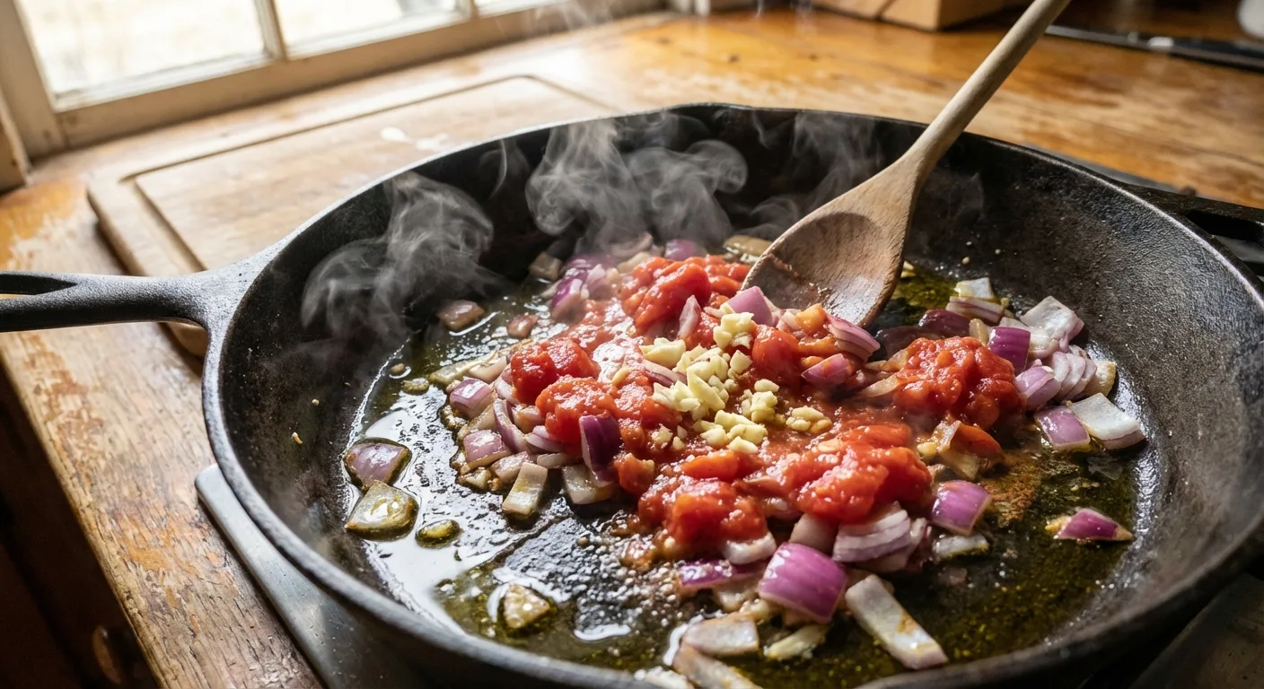 Ayrı bir tavada kalan zeytinyağının yarısıyla soğanları pembeleşinceye kadar kavurun. Sarımsakları ekleyip 1 dakika daha kavurun. Doğranmış domatesleri, tuzu, karabiberi ve şekeri ekleyip domatesler suyunu salana kadar pişirin. Ocaktan alıp kıyılmış maydanozu ekleyin ve karıştırın.