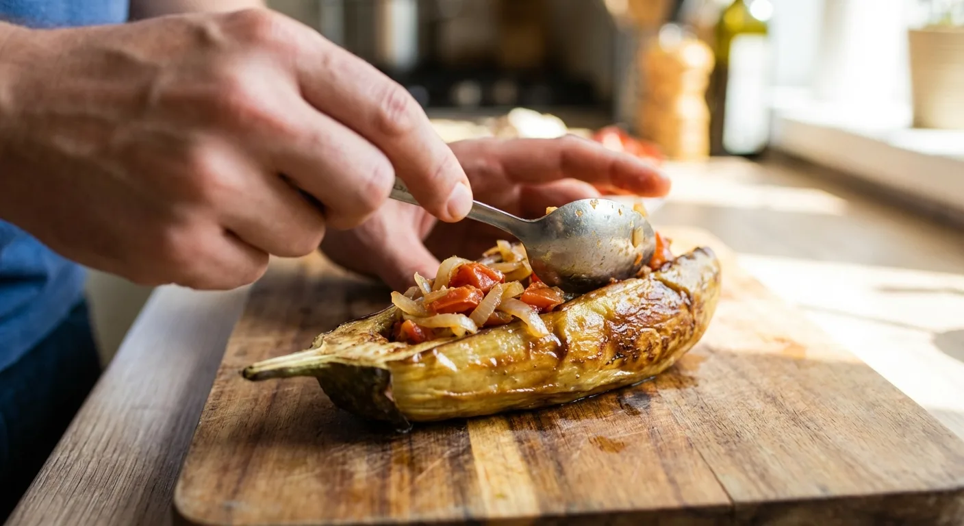Kızarttığınız patlıcanların ortasını bir bıçak yardımıyla yarın ve içlerini hazırladığınız harçla cömertçe doldurun.