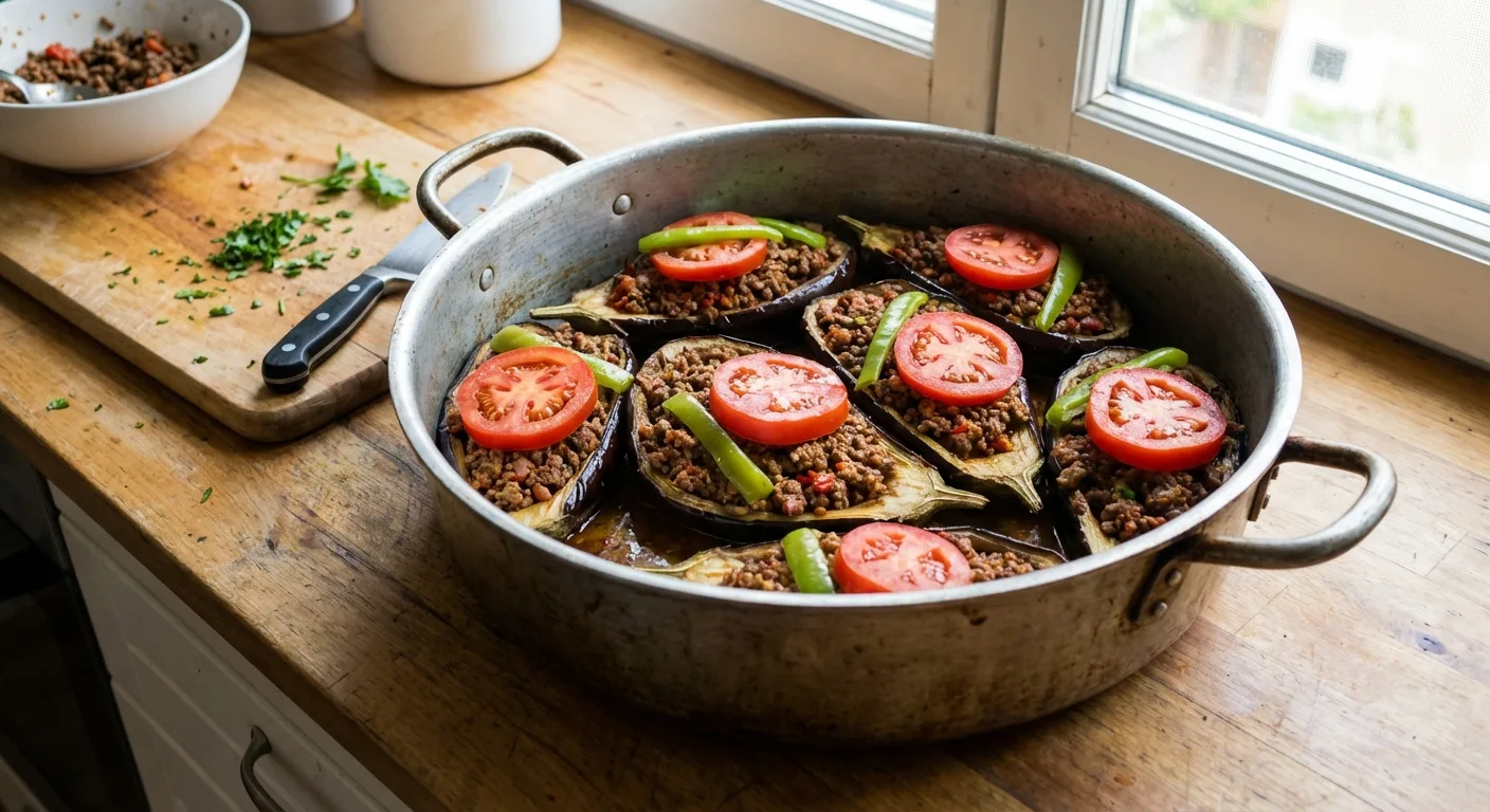 Doldurduğunuz patlıcanları geniş bir tencereye veya fırın tepsisine dizin. Kalan 1 domatesi dilimleyip üzerlerine yerleştirin. Bir kasede sıcak su ve kalan zeytinyağını karıştırıp tencerenin/tepsinin tabanına dökün.