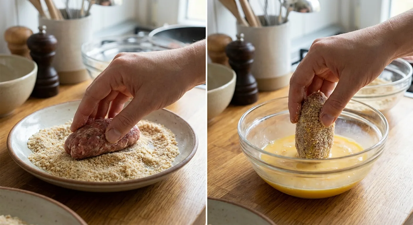 Kalan 1 yumurtayı ayrı bir kapta çırpın. Galeta ununu veya unu düz bir tabağa yayın.