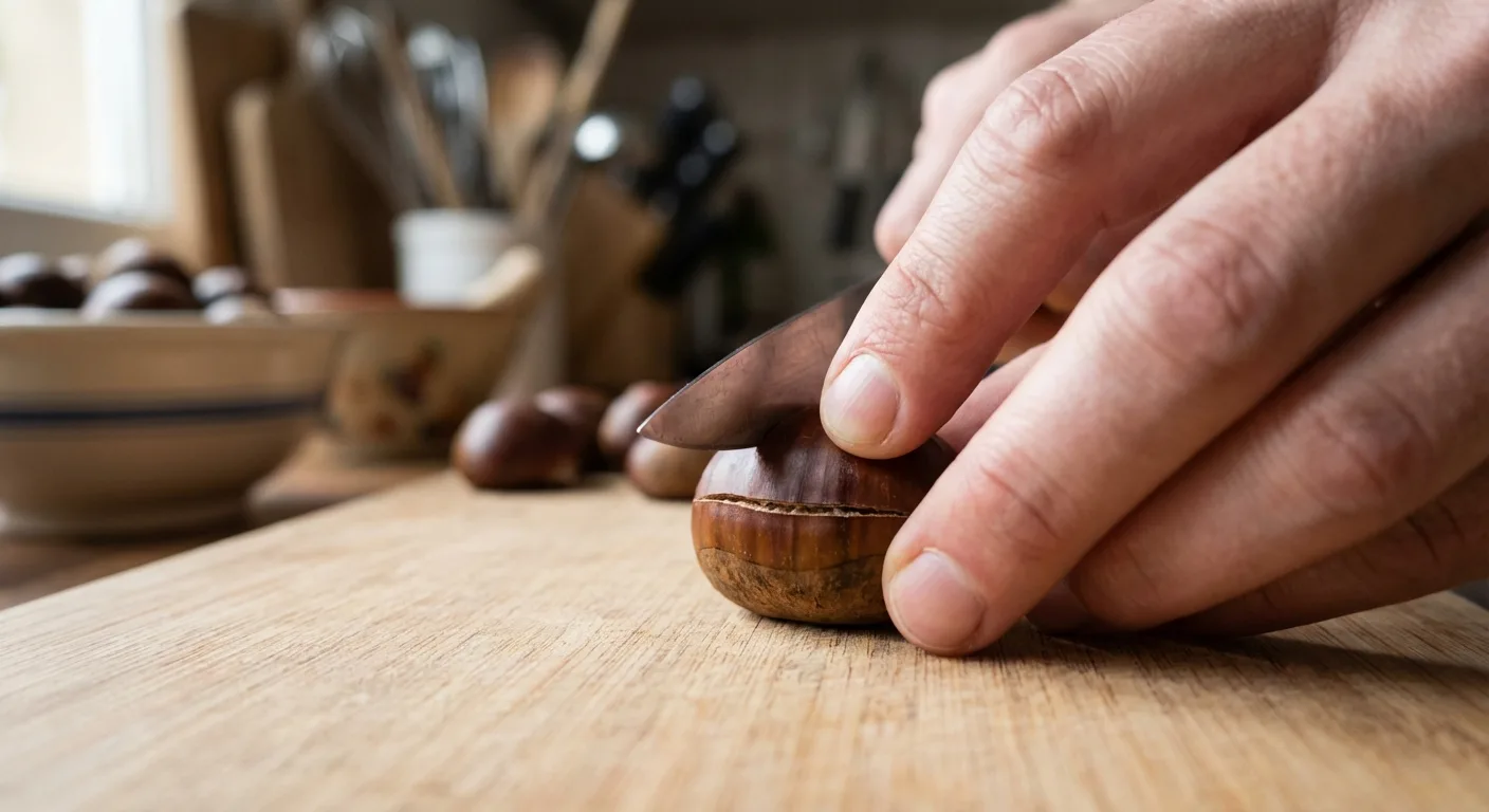 Kestanelerin bombeli kısımlarına, kabuğu ve iç zarını geçecek şekilde enlemesine derin bir çizik atın. Bu, pişerken patlamalarını önler ve kolay soyulmalarını sağlar.