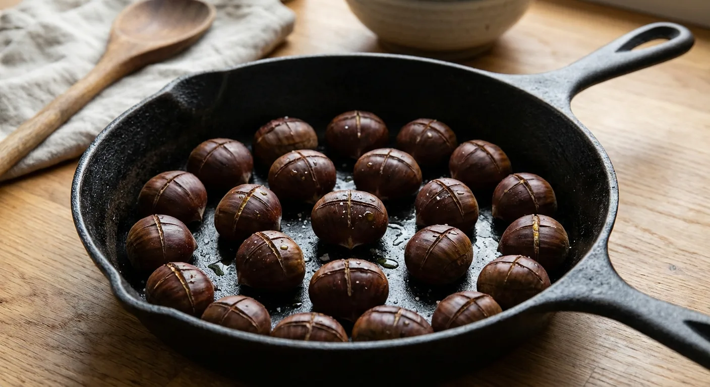 Çizdiğiniz kestaneleri bir tencereye alın ve üzerini geçecek kadar su ekleyip 10 dakika kadar haşlayın. (Bu adım isteğe bağlıdır ancak daha yumuşak olmalarını sağlar).