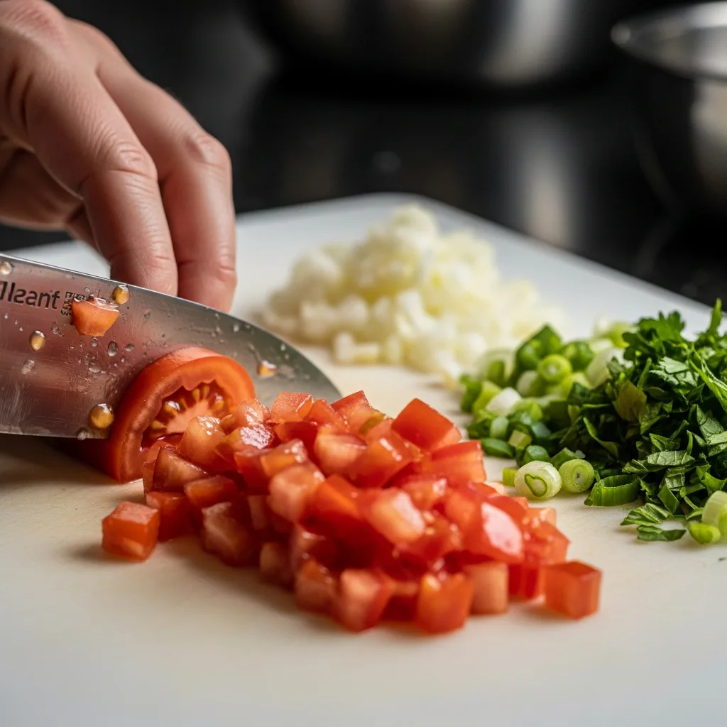 Bulgur şişerken kuru soğanı çok ince doğrayın. Taze soğan, maydanoz ve naneyi de ince ince kıyın. Domateslerin kabuklarını soyup küçük küpler halinde doğrayın.