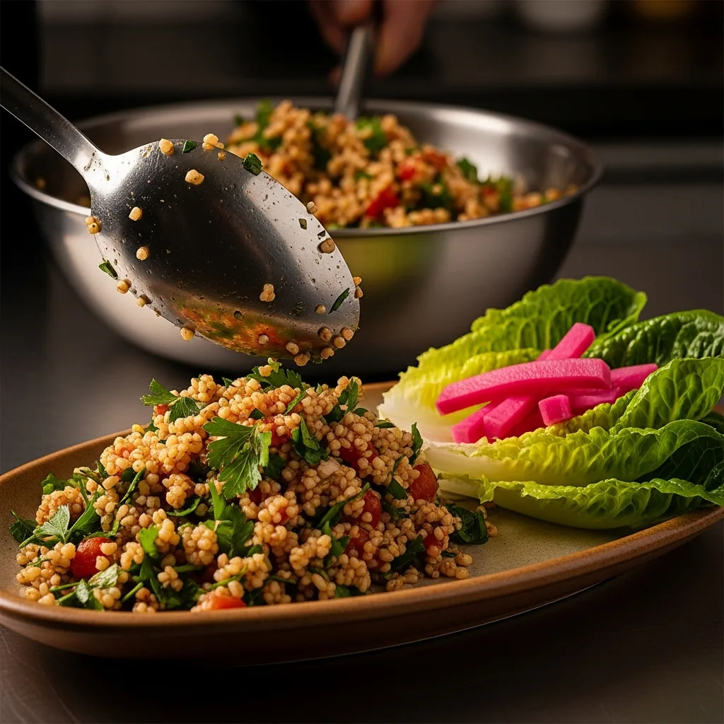 Kısırı servis tabağına alın. Yanında marul yaprakları veya turşu ile servis yapabilirsiniz. Afiyet olsun!