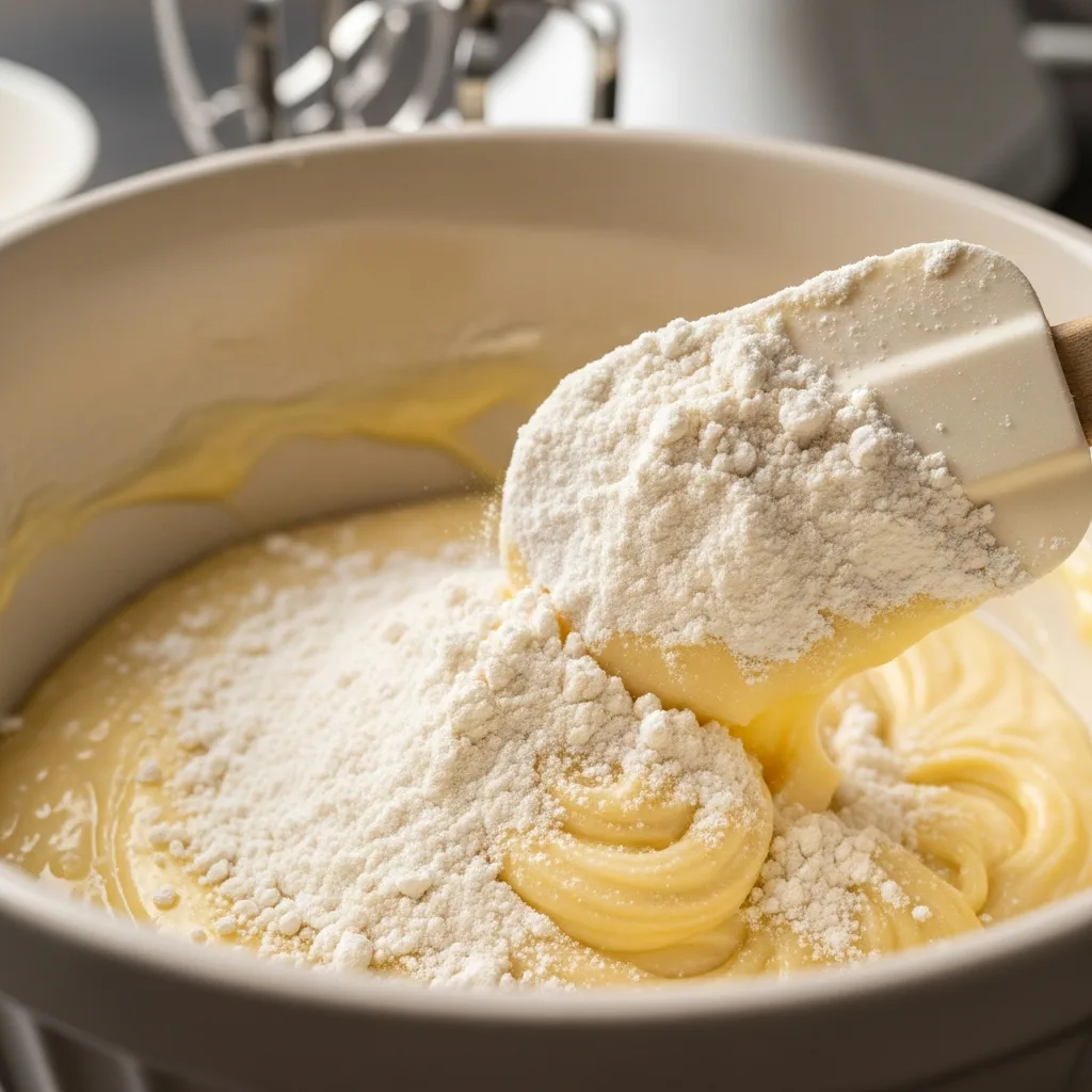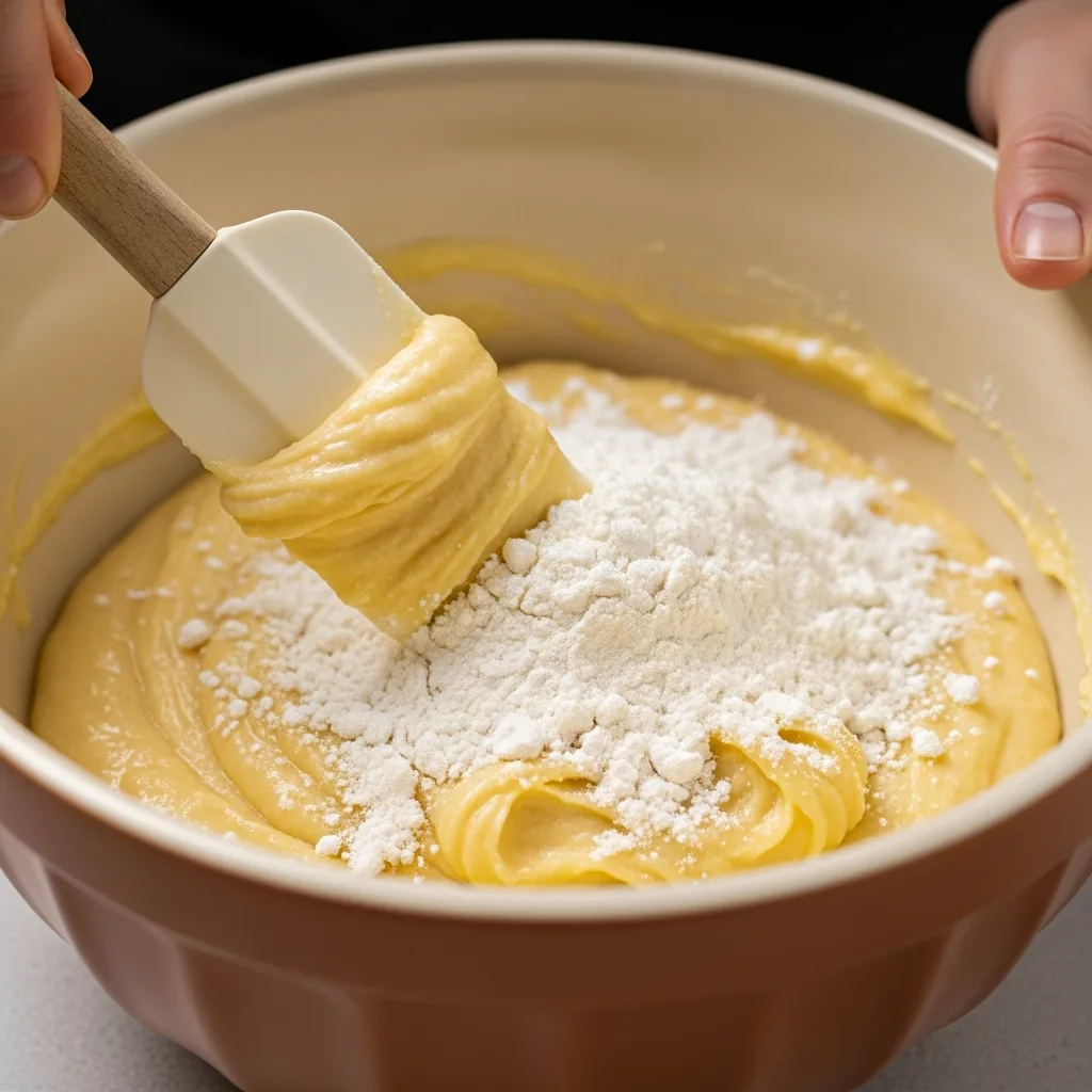 Ayrı bir kapta elediğiniz un, kabartma tozu ve vanilini sıvı karışıma ekleyin. Bir spatula yardımıyla alttan üste doğru yavaşça karıştırarak hamuru söndürmeden yedirin.