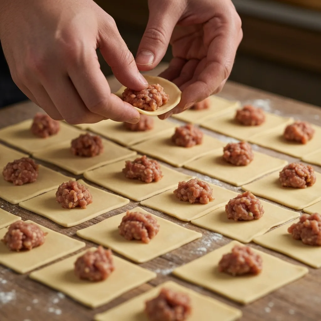 Her karenin ortasına hazırladığınız kıymalı harçtan küçük bir parça koyun.