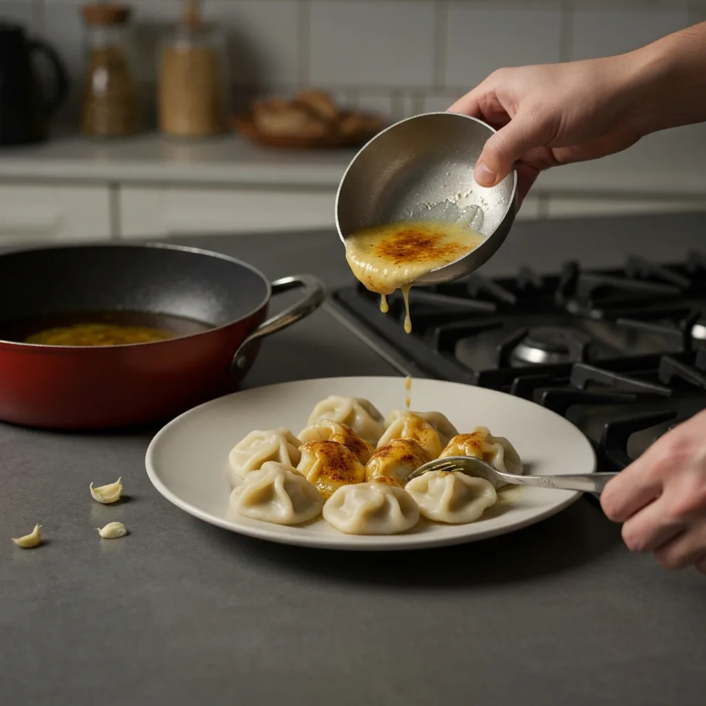Haşlanan mantıları süzerek servis tabağına alın. Üzerine önce sarımsaklı yoğurdu, ardından kızgın tereyağlı sosu gezdirin. Sumak serperek sıcak servis yapın.
