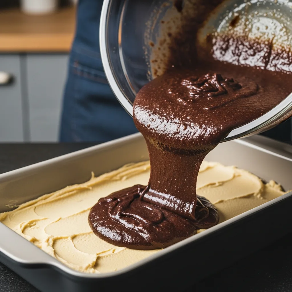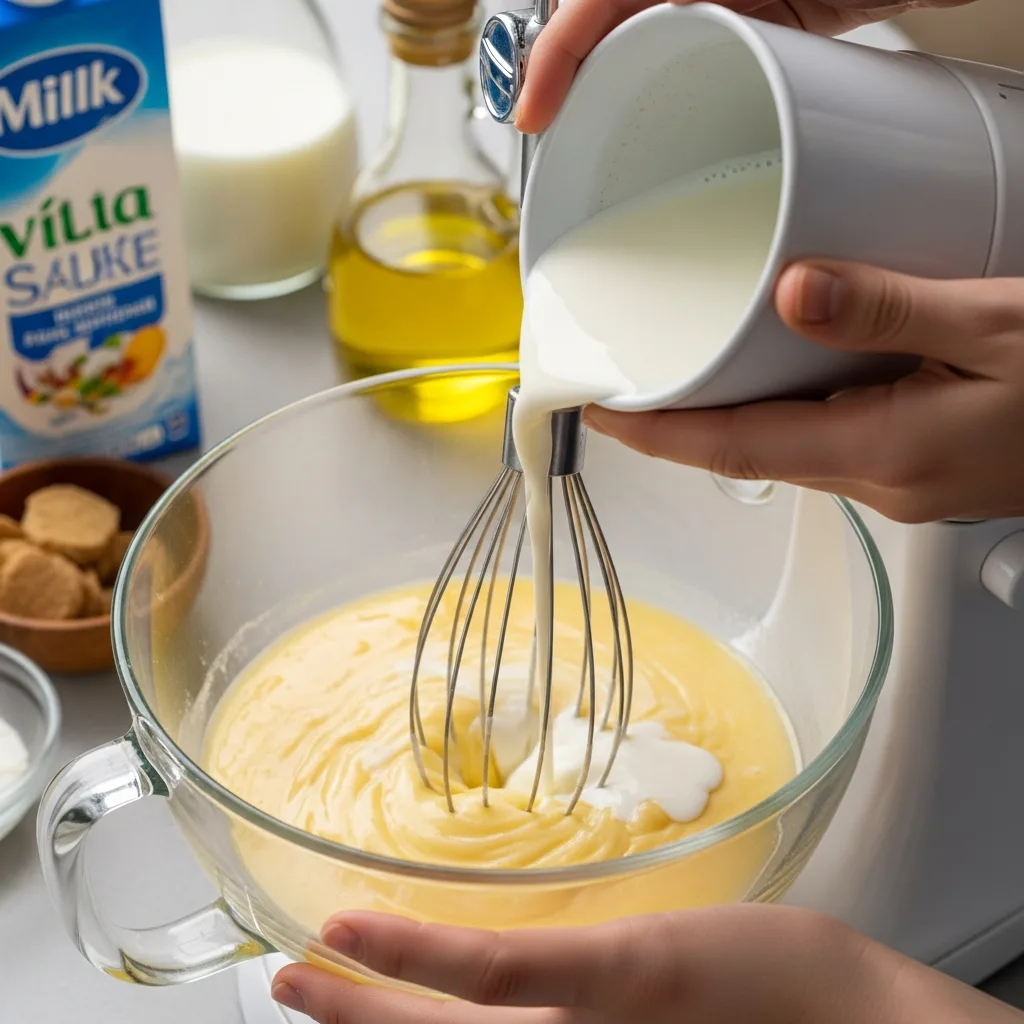 Kek için; yumurta ve şekeri derin bir kapta krema kıvamına gelene kadar çırpın. Süt, sıvı yağ, kakao ve vanilini ekleyip karıştırmaya devam edin.