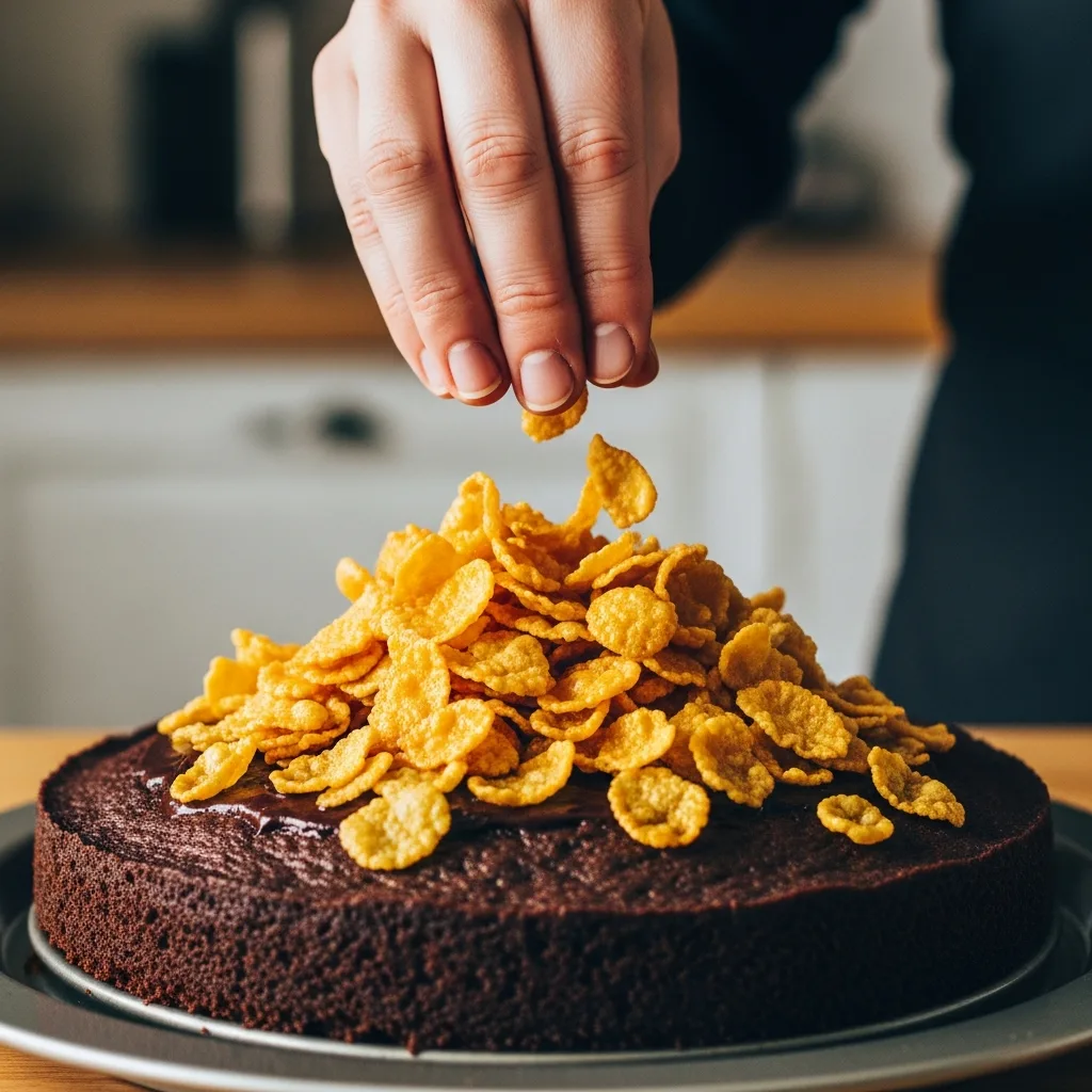 Sosu tamamen çekmiş olan kekin üzerine soğumuş olan çıtır mısır gevreklerini serpip servis edin.