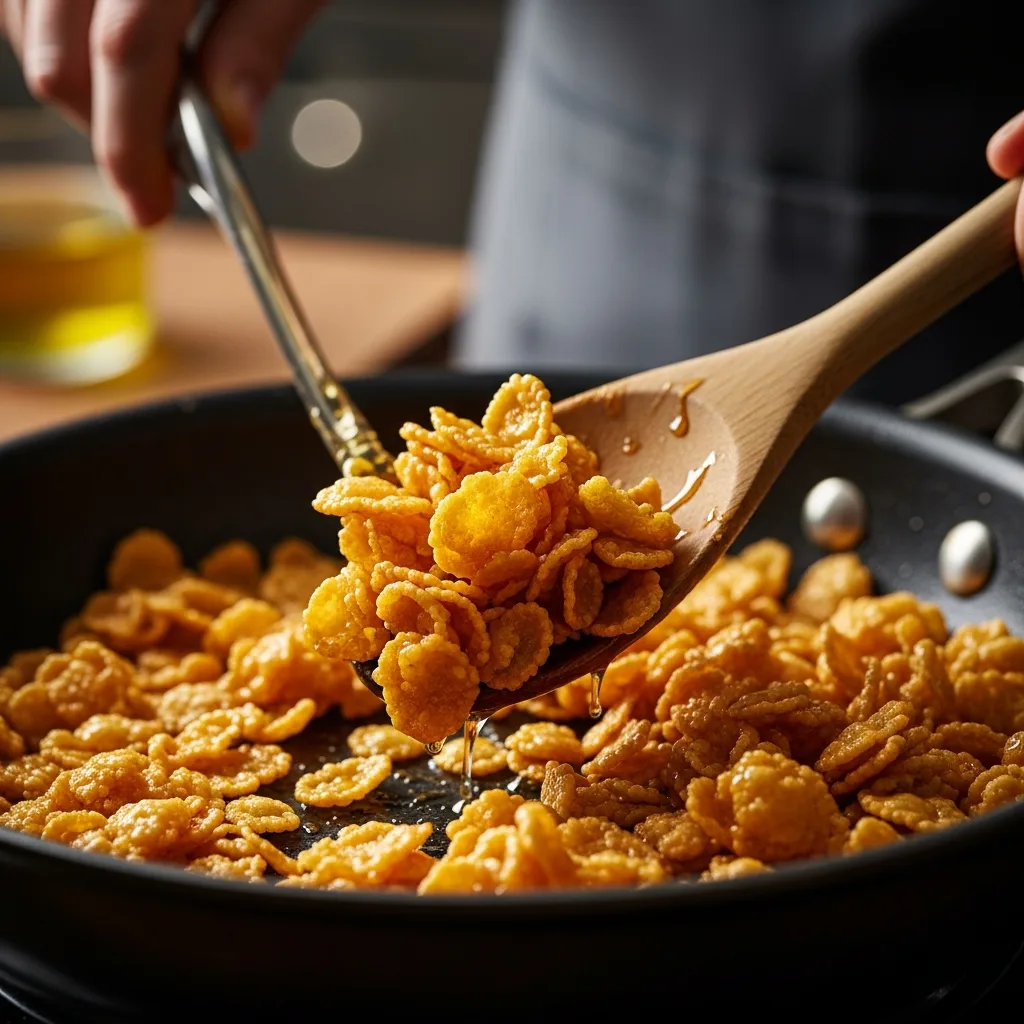 Üzeri için; tereyağını bir tavada eritin, balı ekleyip karıştırın. Mısır gevreklerini ekleyip karamelize bir doku alana kadar birkaç dakika kavurun.